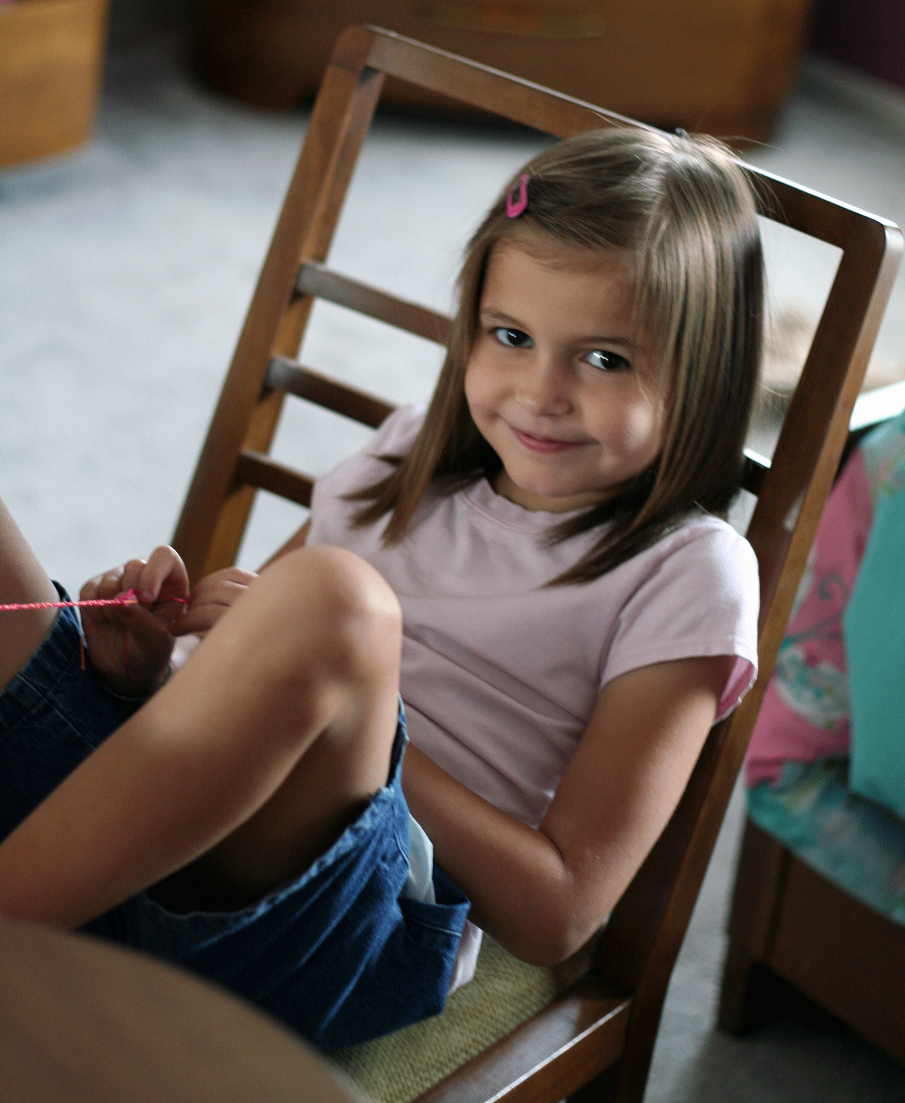 Gracie came in yesterday with her Rapunzel Polly Pocket and wanted me to show her how to braid--I went through it a few times and then she came in several times yesterday and today and showed me the beautiful braids she had put in Rapunzel's hair. I told her about friendship bracelets and told her she could make a few with some colored floss that I have in my craft closet, so we picked out some colors and she went to town. She did the braids on them all on her own and I just tied them on her and cut off the ends, then she made one more and interspersed random knots and straight places and got a plastic "reader" charm out of her toys that she got in school last year. :) I think they look so cute and bring back memories for me, as I loved making these when I was a kid. One of these days I will look up instructions for the knotted kind with more than three strands and show her how to make those. :)